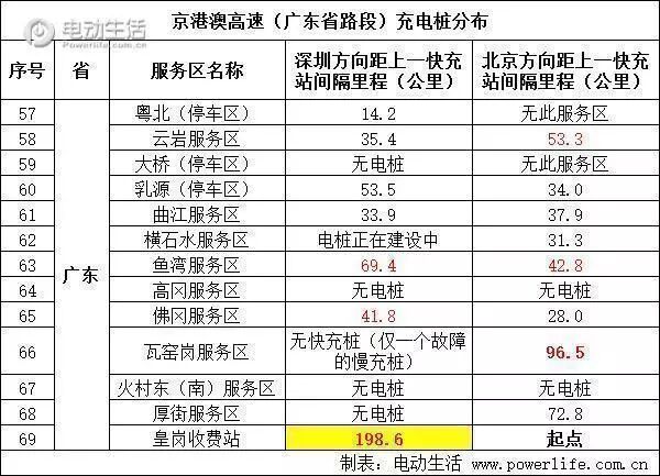 广东省路段单程大约432.6公里,共设立12个服务区,平均30.9公里一个服务区。北京至深圳方向仅有6个快速充电站,从佛冈服务区一直到京港澳高速的终点皇岗收费站的198.6公里便不再有快速充电站,深圳至北京方向,从后街服务区至瓦窑岗服务区相隔96.3公里,期间没有快速充电站。对于最大续航里程不足250公里的纯电动汽车而言,很难从佛冈服务区直接到达深圳,但可以从厚街服务区下高速,到对侧充电站补电。