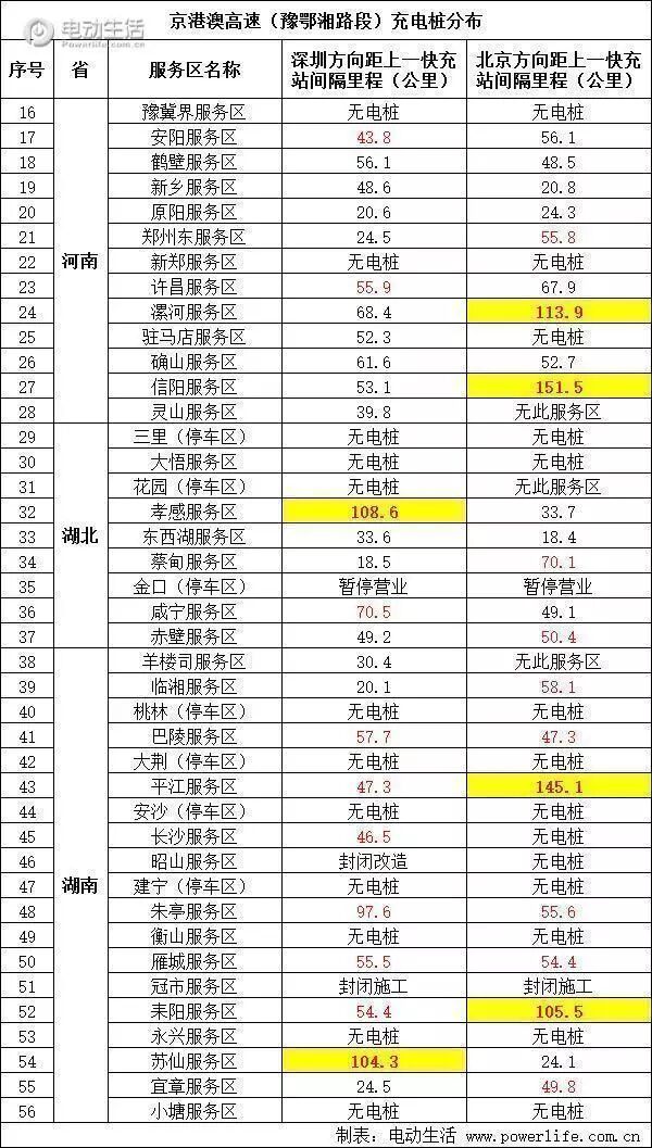 豫鄂湘路段单程大约1350公里,共设有41个服务区(停车区),平均每32.9公里一个服务区(停车区),北京至深圳方向共有26处服务区设有电桩,相隔充电站最大跨度为108.6公里,出现在灵山服务区至孝感服务区路段;而深圳至北京方向则仅有22处服务区设有充电站,从朱亭服务区至平江服务区跨度145.1公里,从孝感服务区至信仰服务区跨度达到151.5公里,两个路段跨度都比较大,对于最大续航里程200公里左右的纯电动汽车而言,会显得比较吃力。