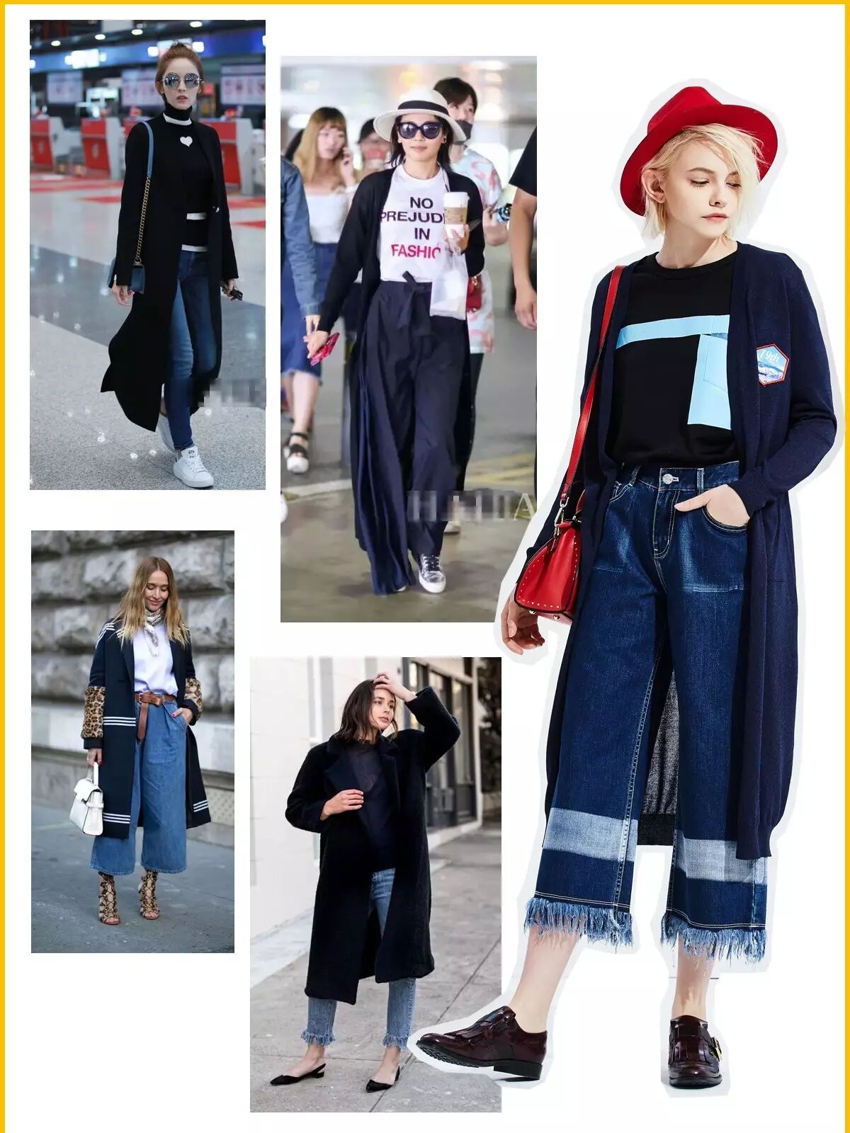 薄款蓝色针织开衫刘涛、娜扎机场街拍示范,经典长度万能百搭,今年秋季流行搭配宽腿裤和毛边牛仔裤,瘦腿小脚裤是最经典的搭法,显瘦显高。
