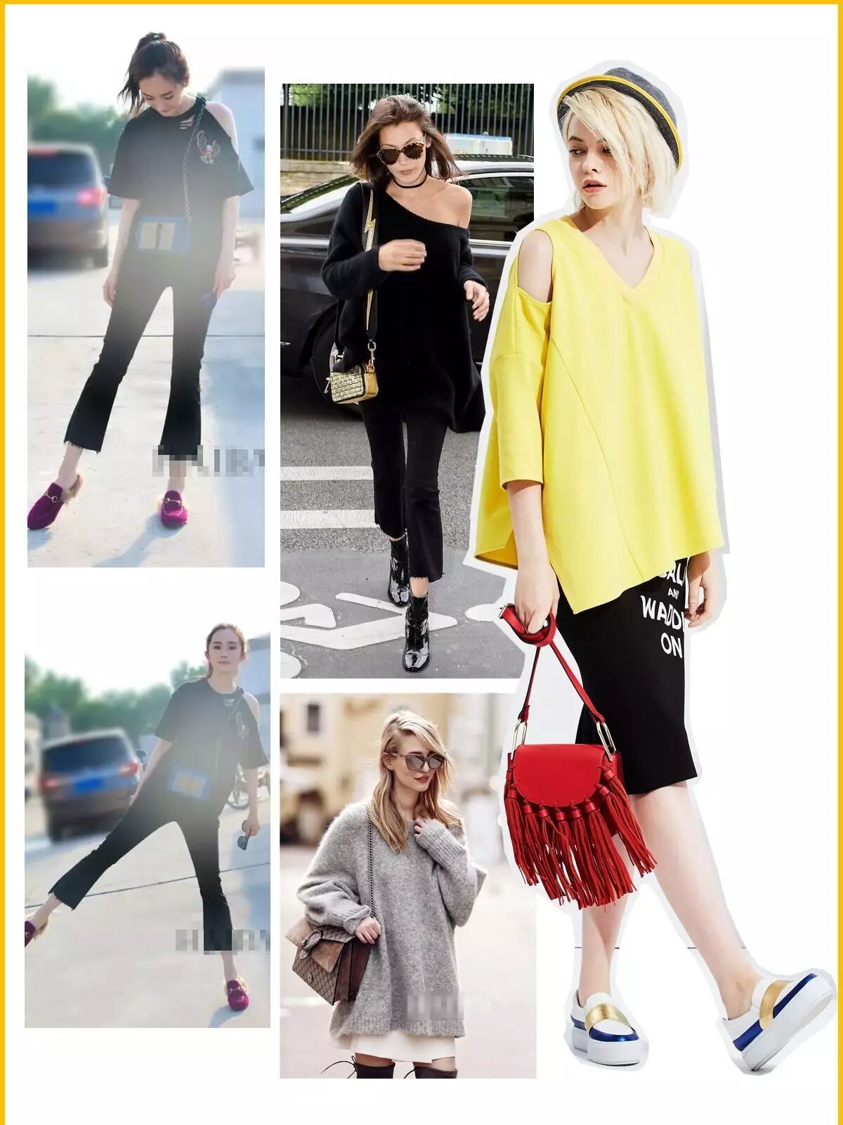 露肩针织套头衫杨幂街拍风格款,延续流行夏季肩上风情,秋季的针织面料更贴合季节温度温差。宽松款式休闲显慵懒时髦气质。