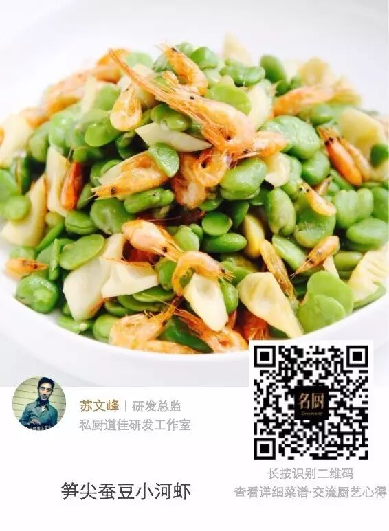 苏文峰师傅的笋尖蚕豆小河虾也很有新意,三种食材之间的搭配清爽宜人。蚕豆开锅后焯水一分钟便可达到绵软的口感;新鲜活河虾个头不宜过大。