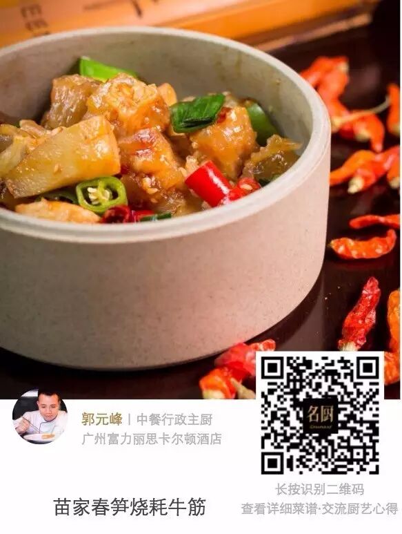 笋与肉同样相辅相成,来自广州的郭元峰师傅就将少见的牦牛筋与春笋一同烧制,用贵州椒和蒜苗做出了苗家的风味。要避免春笋麻口,煮熟后需用水冲洗。