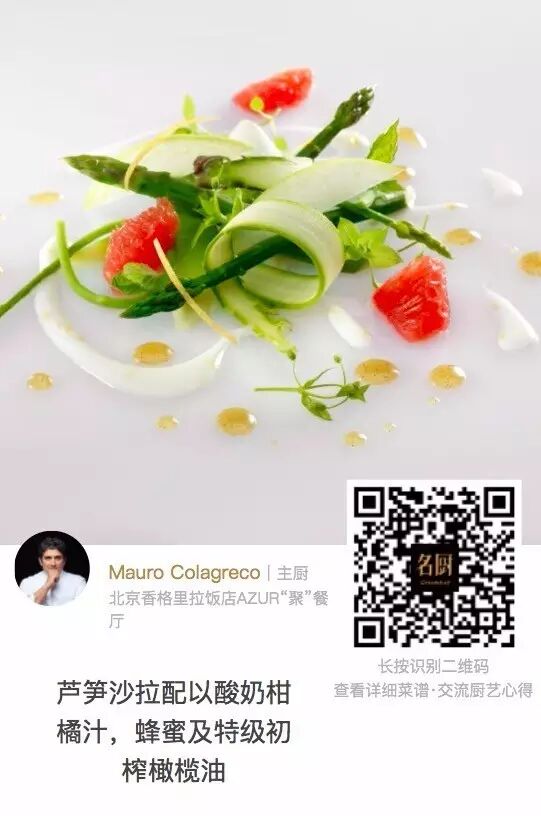 名厨APP的Chef Mauro的芦笋沙拉中,芦笋在沸水中过30秒,保证7分熟是其特色。除了将竹笋做成刨片和长条两种形状,还加入了西柚、橙子和蜂蜜,让沙拉更具春意。