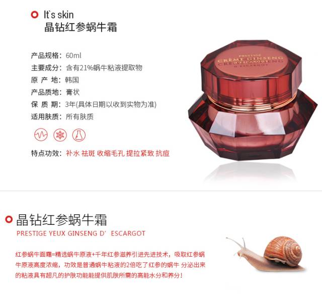 小编点评:蜗牛霜这款是出名的好。品牌,口碑相当的不错,都说如果觉得雪花秀,后,价格贵,那就可以选择伊思红参,这瓶红参面霜,里面所含的蜗牛粘液浓度也别高,味道香香的,但是抹上肌肤,一点不会觉得油腻!