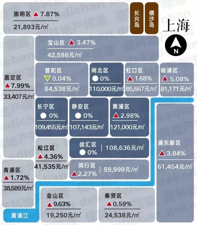 以下图表均为各城新建商品住宅均价(百分比数值为环比涨跌幅)——