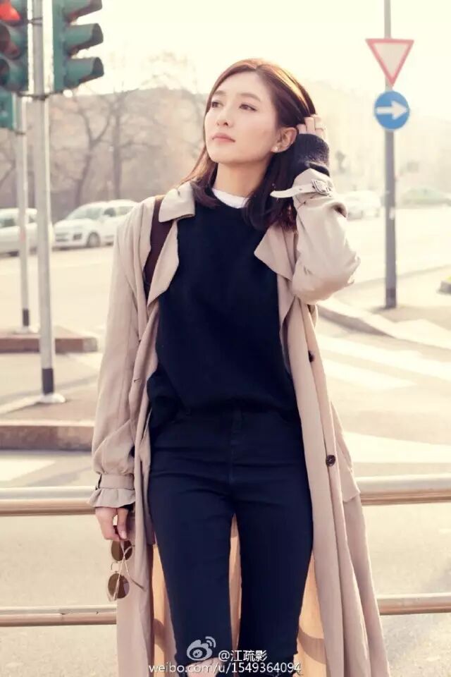 江疏影也是风衣的爱好者。风衣搭配毛衣和破洞牛仔裤,再搭配一双尖头高跟鞋,随性又很有韵味。▼