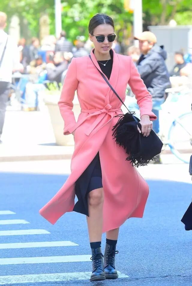 Jessica Alba在选风衣时,偏爱粉色。