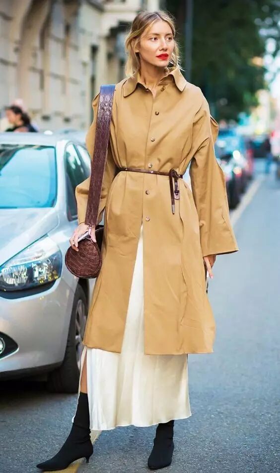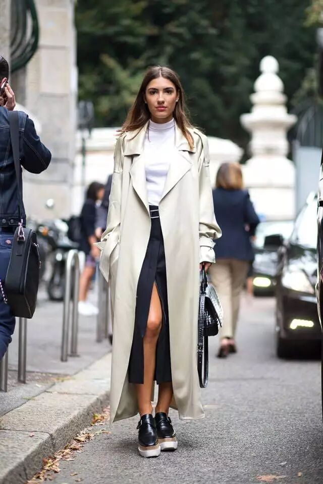 风衣有时可以起到裙子的功效,如果再穿一条裙子太沉闷的话,可以选择开叉裙,更清透一些。