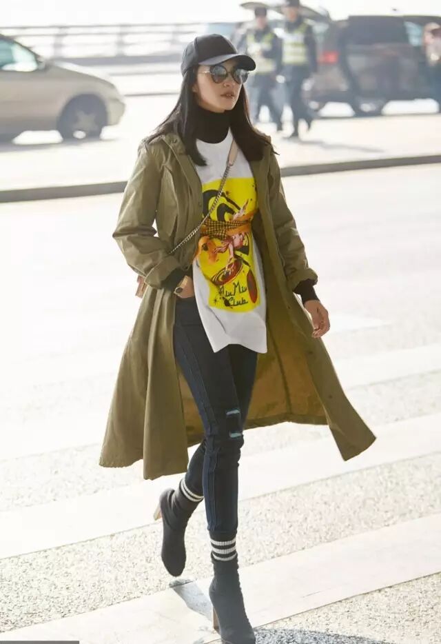 风衣虽然看起来蛮正式,不过用年轻、街头的元素配起来照样会很有活力,姚晨用鸭舌帽、卡通T恤以及高筒棉袜就完全改变了它的feel。