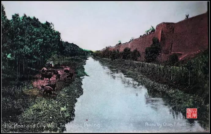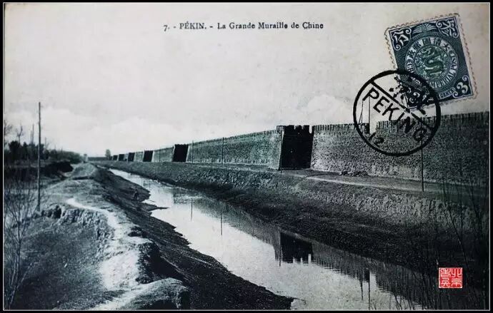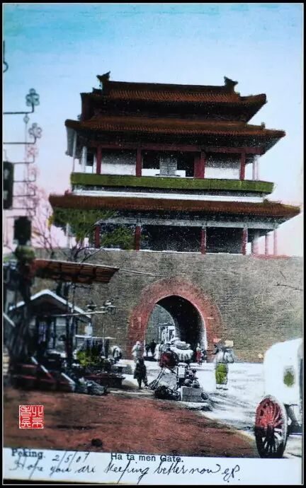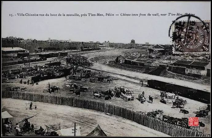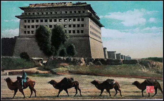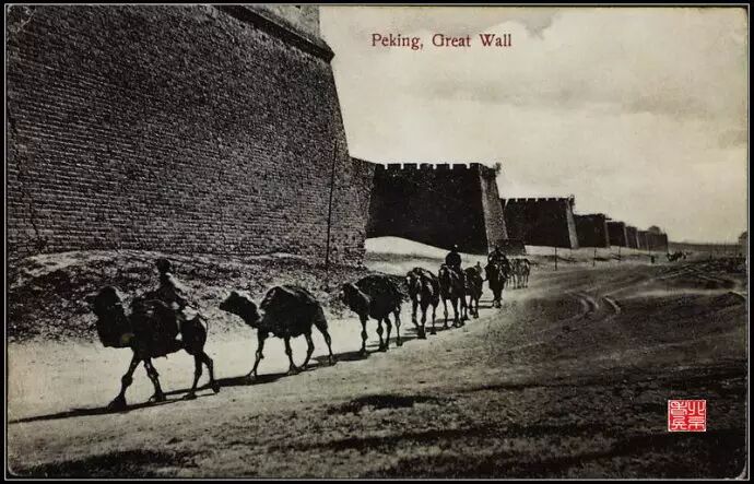 行经北京城外的骆驼队(现二环路一带),1908年4月自北京经上海寄苏格兰。民信片上的英文是“北京长城”,其实这是城外的一段城墙,看来这位拍摄者一定是位外国人。