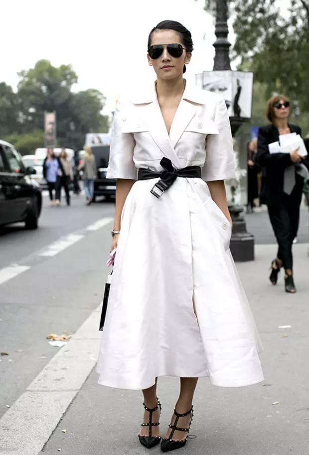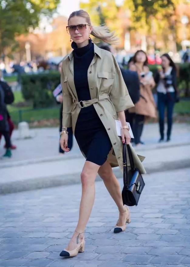 风衣带着一些中性的酷酷的感觉,而裙装是充满女人味的服饰,两者的搭配更别有一番风味。