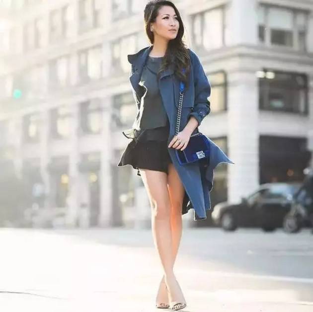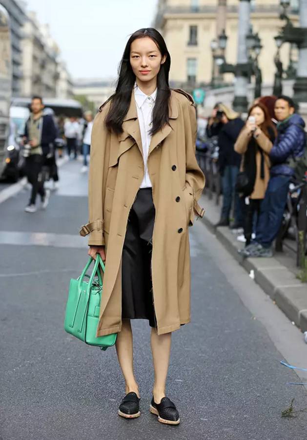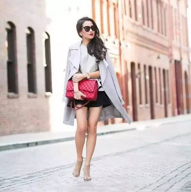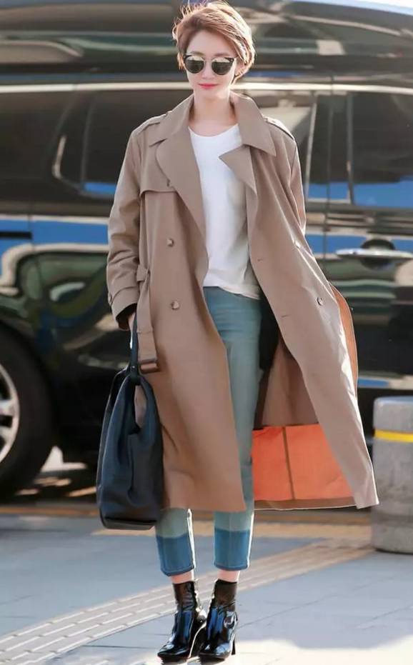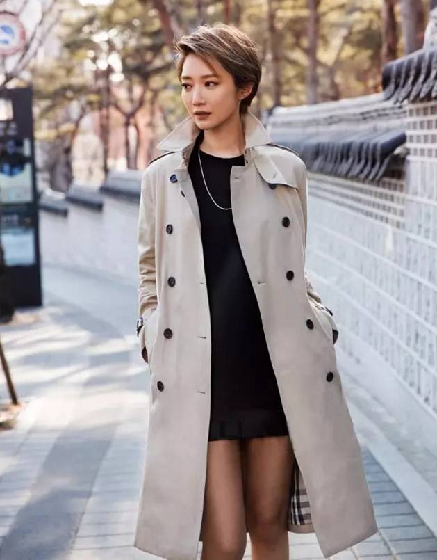 娇小身材的妹子适合穿短款和中长款风衣,太长会难以驾驭,显得没精神。