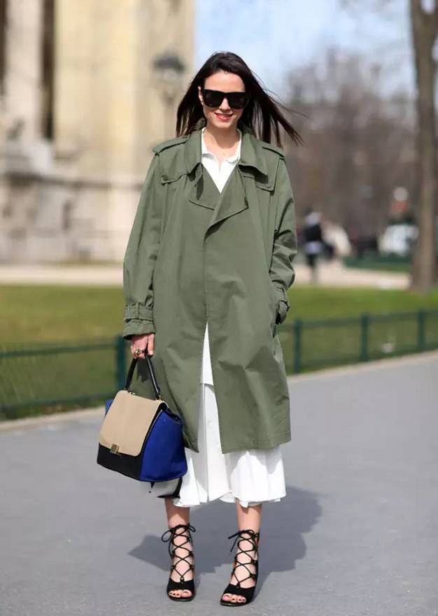 军绿色其实是一个看起来可能显老,但其实搭配条纹衫和短裙,一样是年轻的出街范儿。
