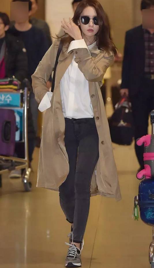 风衣的宽松下搭配紧身裤已经算是标配了,毕竟上松下紧的搭配能够让腿看起来更细。