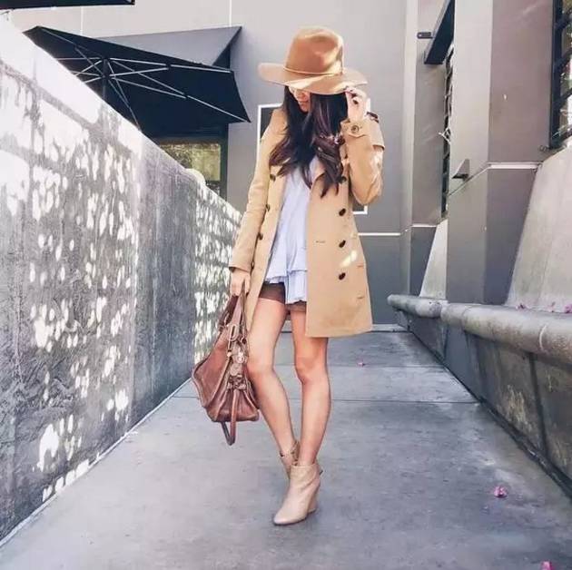 短款风衣永远是小个子女生的最佳伴侣,在风衣里搭配T恤和短裙,拉高腰线,反而更显高挑哦。
