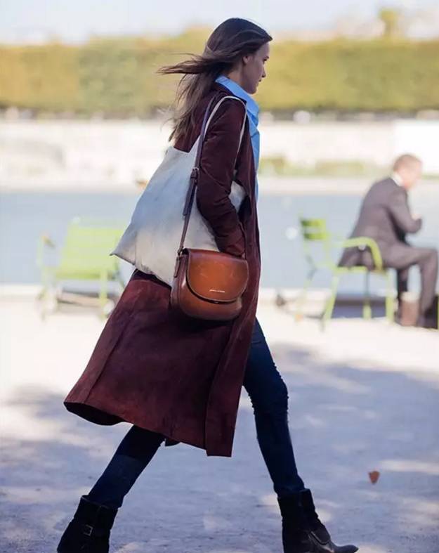 包包与鞋子色彩呼应,而且都选择了低调的黑色,让风衣更加出众,早春这样穿再适合不过了。