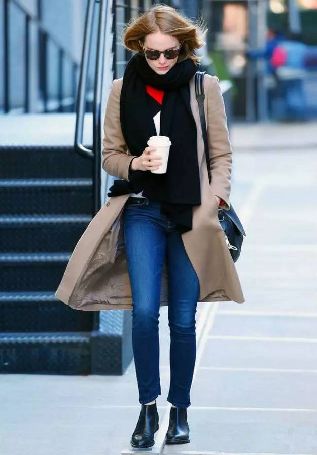 黑色围巾与鞋子包包色彩呼应,让造型更具旋律感,别致的搭配被驼色的温暖包裹着,时尚却又不失大牌感。
