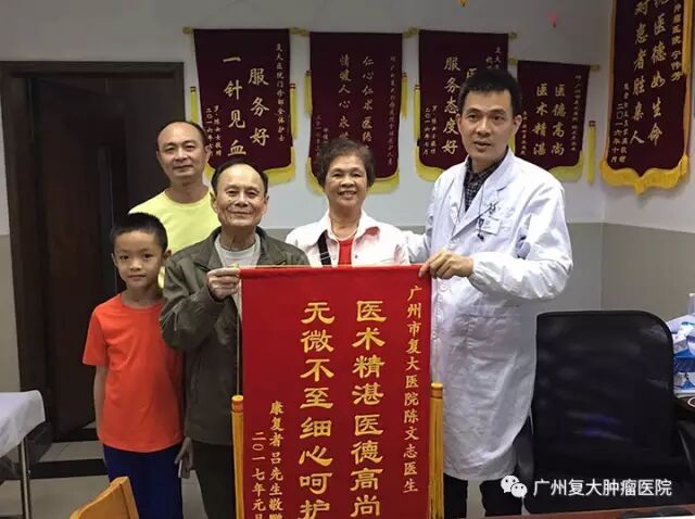 1月9日,患有慢性支气管炎的吕伯,带着一家大小来到复大肿瘤医院海珠院区门诊,向内科医生陈文志赠送锦旗表示感谢。