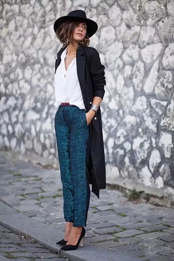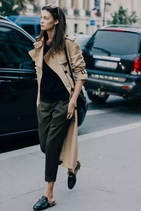 风衣和烟管裤搭配,相当干净利落的穿法,又精神又气场全开,作为拉风的通勤搭配最适合不过了!