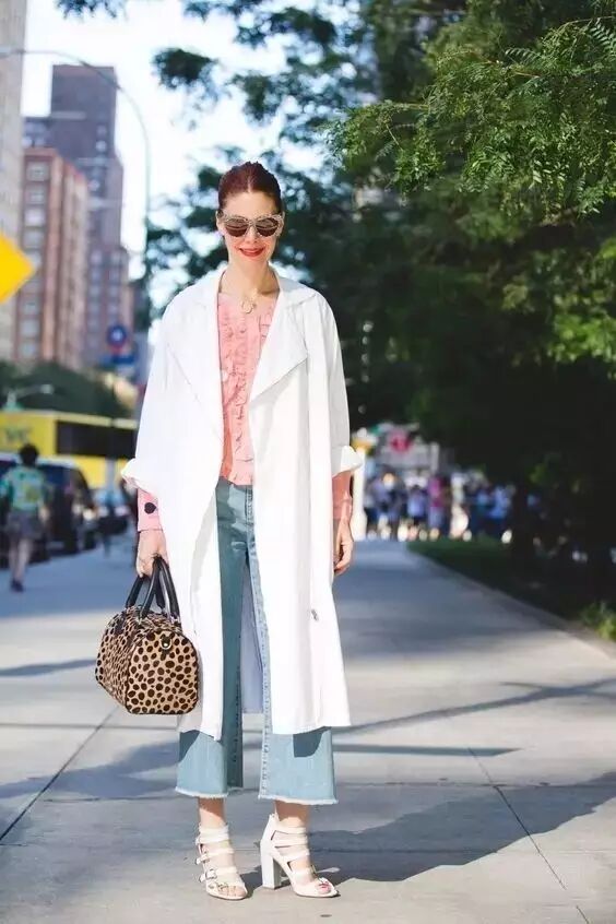 牛仔裤换成七八分阔腿型的,搭配衬衫和利落的风衣,配上高跟鞋,大方优雅。