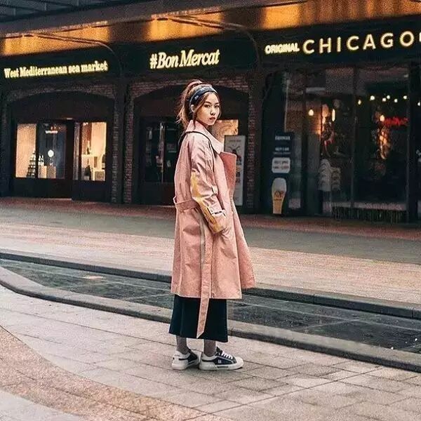粉嫩色系的风衣搭配七八分阔腿裤,再get个短袜+运动鞋的穿法,十分的韩范~