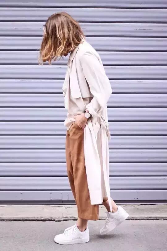 及小腿肚的风衣搭配九分阔腿裤和小白鞋,十分的休闲。