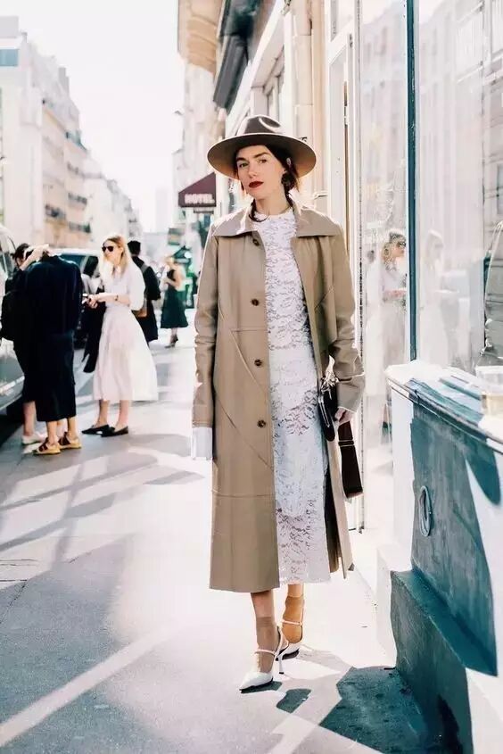 驼色风衣内搭一条白色连衣蕾丝长裙可以很显白,配上同色系的高跟鞋,拔高身高又保持色彩干净,看起来甜美优雅。