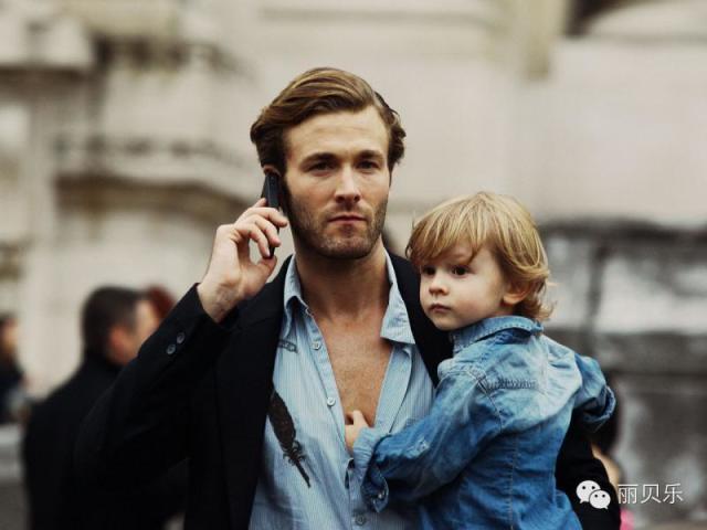 商务装的帅爸与休闲牛仔宝贝,俩人有爱的出街引人注目~