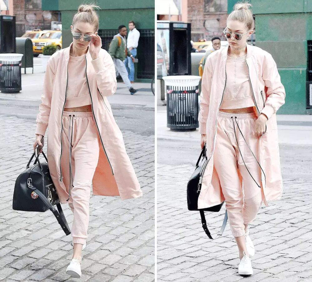 除了长风衣,Gigi这件粉色的长款MA1外套也是挺特别,酷的有些韩国风~