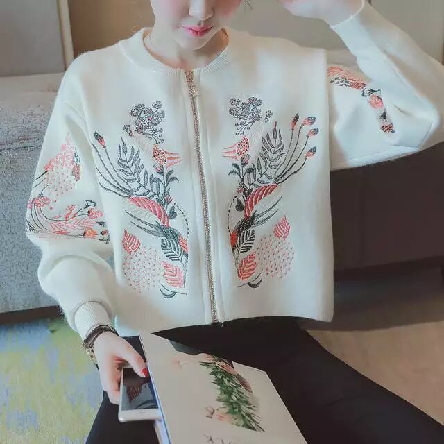 圆领合身版型,时尚优雅的圆领,在视觉上更能显瘦修饰脸型,长袖更显随意休闲,前身金属中国拉链开衫,温婉大方,清新的花朵刺绣勾勒,优雅别致!不规则前短后长衣摆,很有设计感~看着很简单的版型,却很有味道哦!