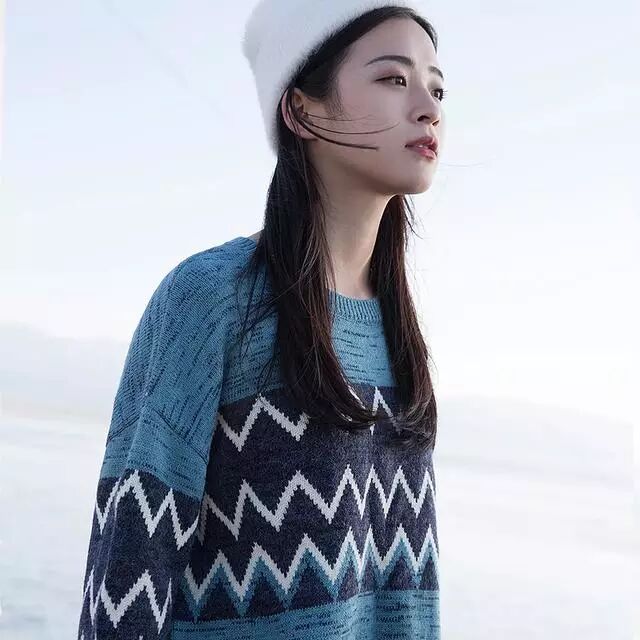 杂色线织就的套头衫,蓝色底清清爽爽的,杂线自带的错落有致的花纹点缀其间,富于变化。中间穿插了深蓝底白色的波普纹饰,复古又大气。圆领塌肩袖,宽宽松松的版型,很适合搭配半裙和牛仔裤。