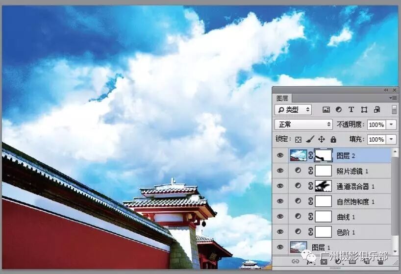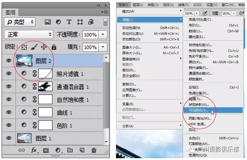关键技术:“自然饱和度”调整图层、“通道混合器”调整图层、“照片滤镜”调整图层、“可选颜色”命令。