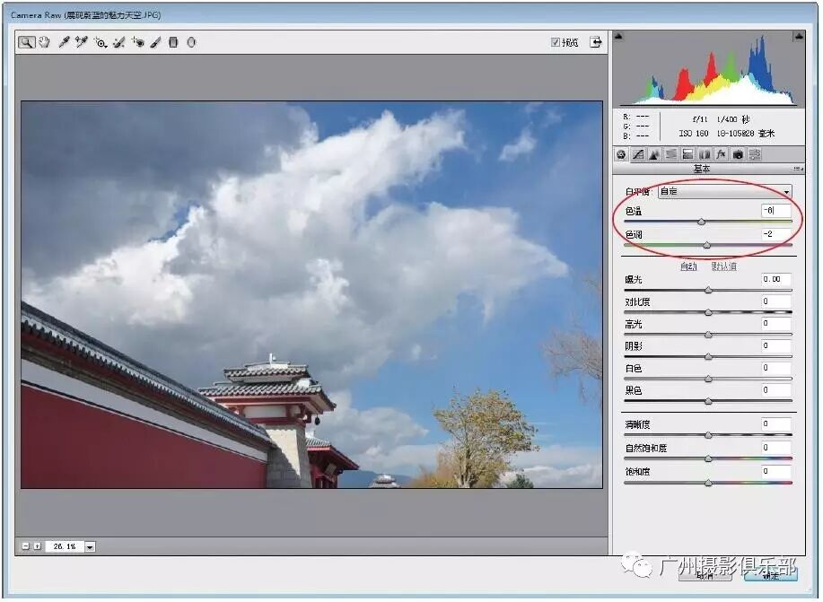 步骤2 展开“基本”面板,在“白平衡”选项区中设置“色温”为-8、“色调”为-2。