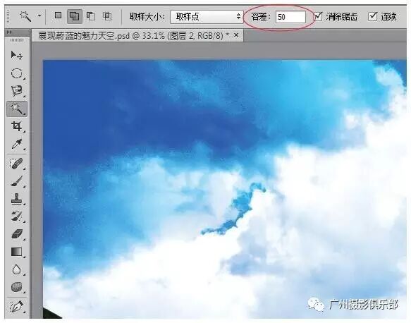 步骤3 选取工具箱中的魔棒工具,在工具属性栏中设置“容差”为50。
