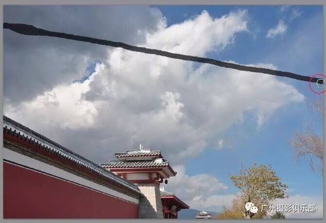 步骤5 移动鼠标至图像编辑窗口中,在电线上单击鼠标左键并拖曳涂抹,鼠标涂抹过的区域呈黑色显示,如图所示。