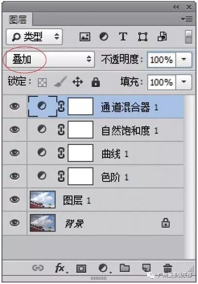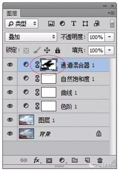步骤5 设置“通道混合器1”调整图层的混合模式为“叠加”,效果如图所示。