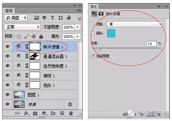 步骤7 新建“照片滤镜1”调整图层,展开“照片滤镜”属性面板,设置“滤镜”为“青”、“浓度”为12%。