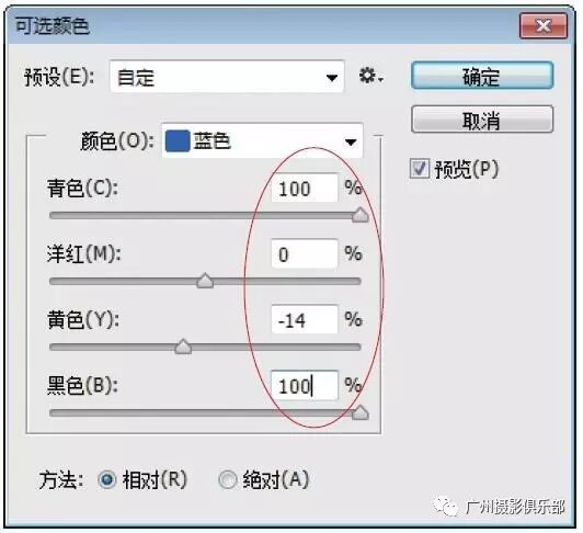 步骤13 切换至可选颜色为“蓝色”,设置“青色”为100%、“洋红”为0%、“黄色”为-14%、“黑色”为100%。