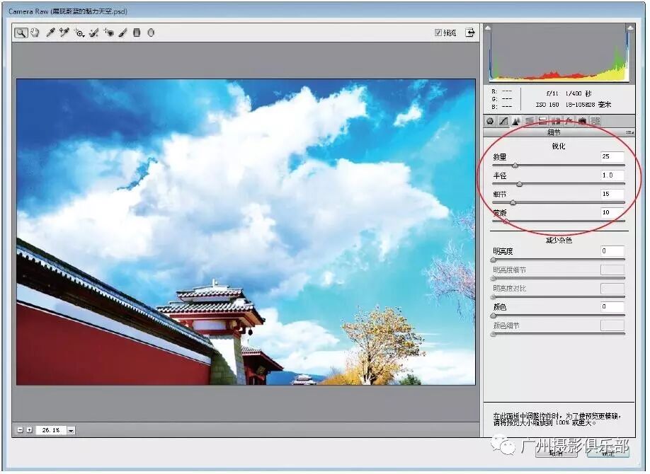 步骤3 在“锐化”选项区中设置“数量”为25、“半径”为1、“细节”为15、“蒙版”为10,效果如图所示。