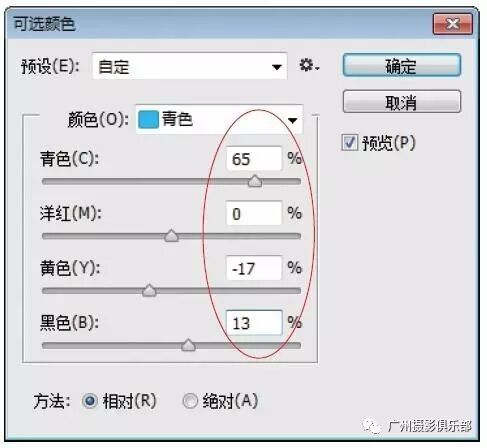 步骤11 在“青色”通道中,设置“青色”为65%、“洋红”为0%、“黄色”为-17%、“黑色”为13%。