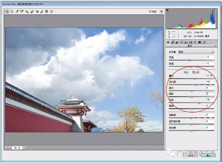 步骤3 设置“曝光”为0.7、“对比度”为19、“白色”为35,调整照片的影调。