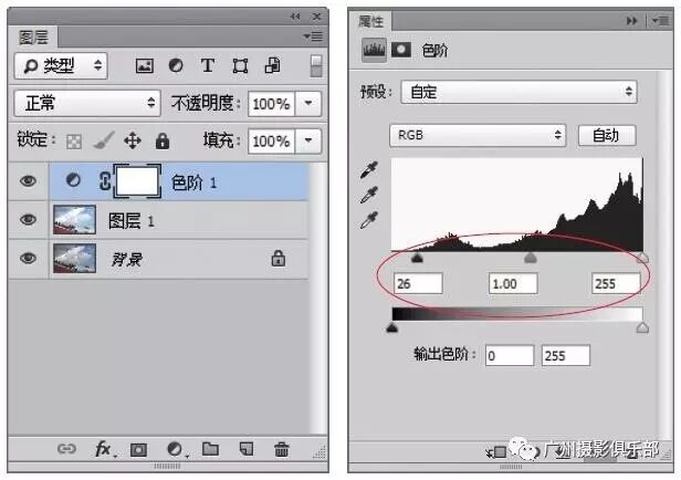 步骤5 新建“色阶1”调整图层,展开“色阶”属性面板,设置RGB输入色阶参数值分别为26、1、255。