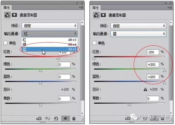 步骤3 新建“通道混合器1”调整图层,展开“通道混合器”属性面板,在“输出通道”列表框中选择“蓝”通道,设置“红色”为-200%、“绿色”为200%、“蓝色”为200%。