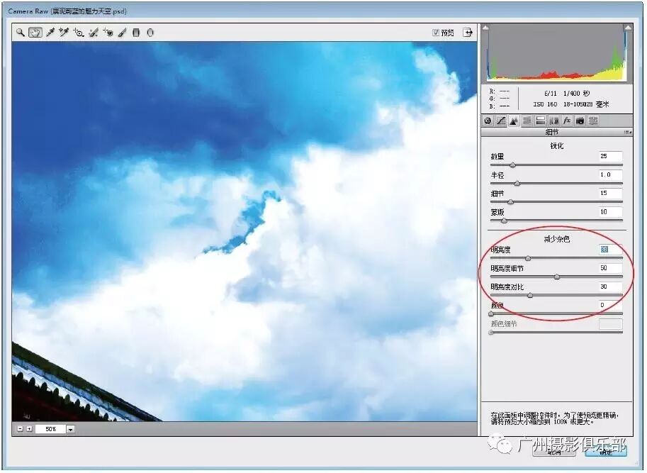 步骤4 适当放大图像显示,在“减少杂色”选项区中设置“明亮度”为68、“明亮度细节”为33、“明亮度对比”为19,即可减少画面中的亮度噪点,效果如图所示。