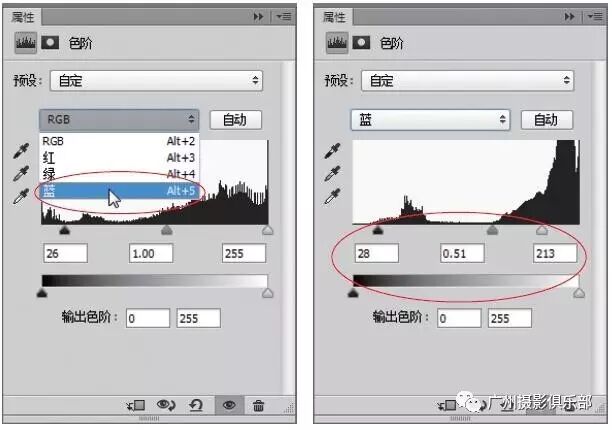 步骤7 在通道列表框中选择“蓝”通道,设置输入色阶参数值分别为28、0.51、213。