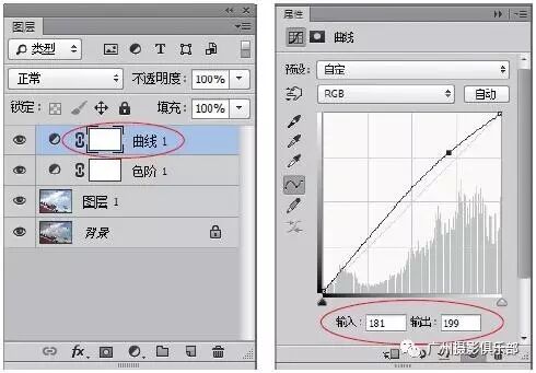 步骤9 新建“曲线1”调整图层,展开“曲线”属性面板,在网格上添加一个曲线点,设置“输入”为181、“输出”为199。