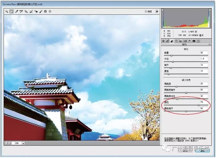 步骤5 在“减少杂色”选项区中设置“颜色”为79、“颜色细节”为50,即可减少画面中的颜色噪点。