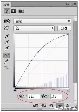 步骤13 在通道列表框中选择“蓝”通道,在网格上添加一个曲线点,设置“输入”为111、“输出”为171。