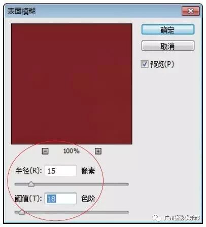 步骤6 弹出“表面模糊”对话框,设置“半径”为15像素、“阈值”为18色阶。