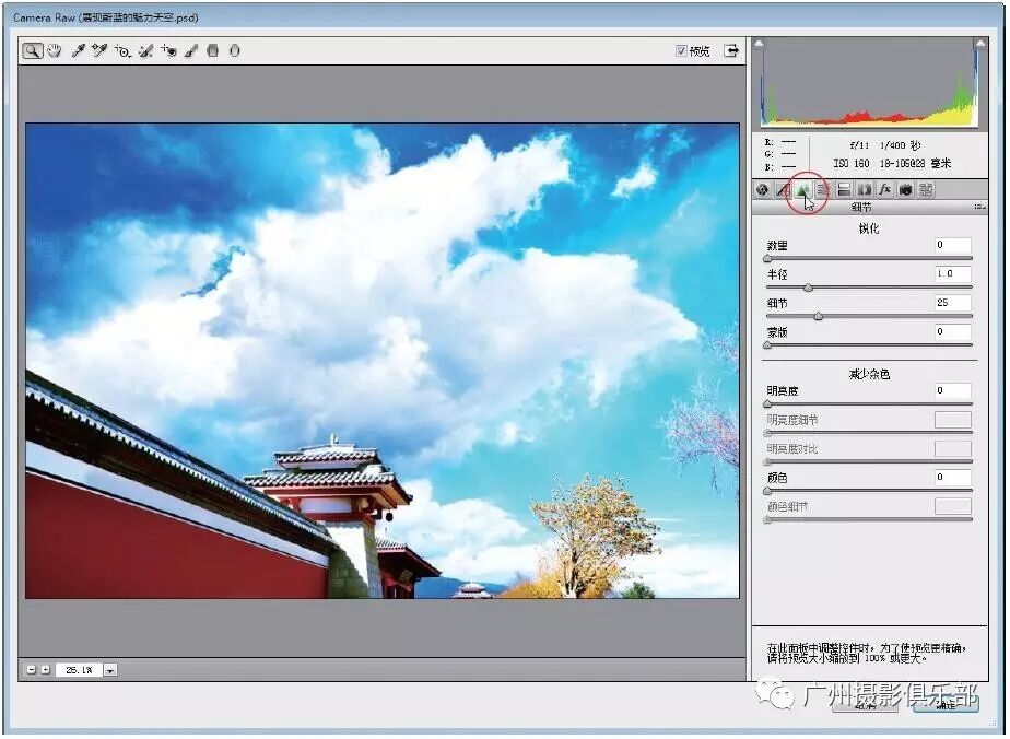 步骤2 单击“滤镜”|“Camera Raw滤镜”命令,弹出“Camera Raw”对话框,切换至“细节”面板。